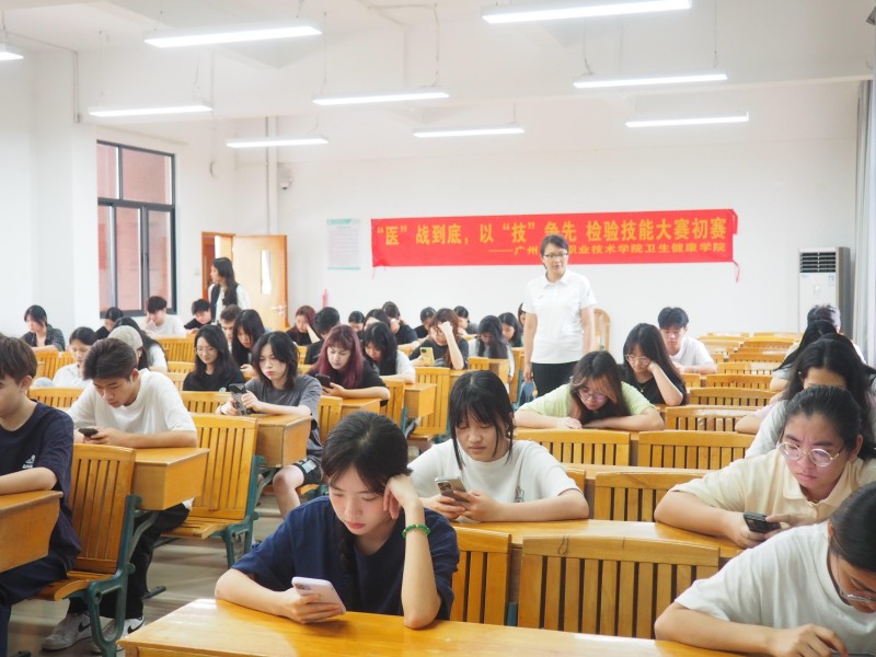 大赛分为初赛、决赛以及技能展示三个部分。 初赛现场,同学们都在聚精会神的做题,力争上游。娴熟的技能需要强大的理论知识做支撑,初赛题库直接对标检验技师系列考试,契合学院“岗、课、赛、证”融通的教学理念。